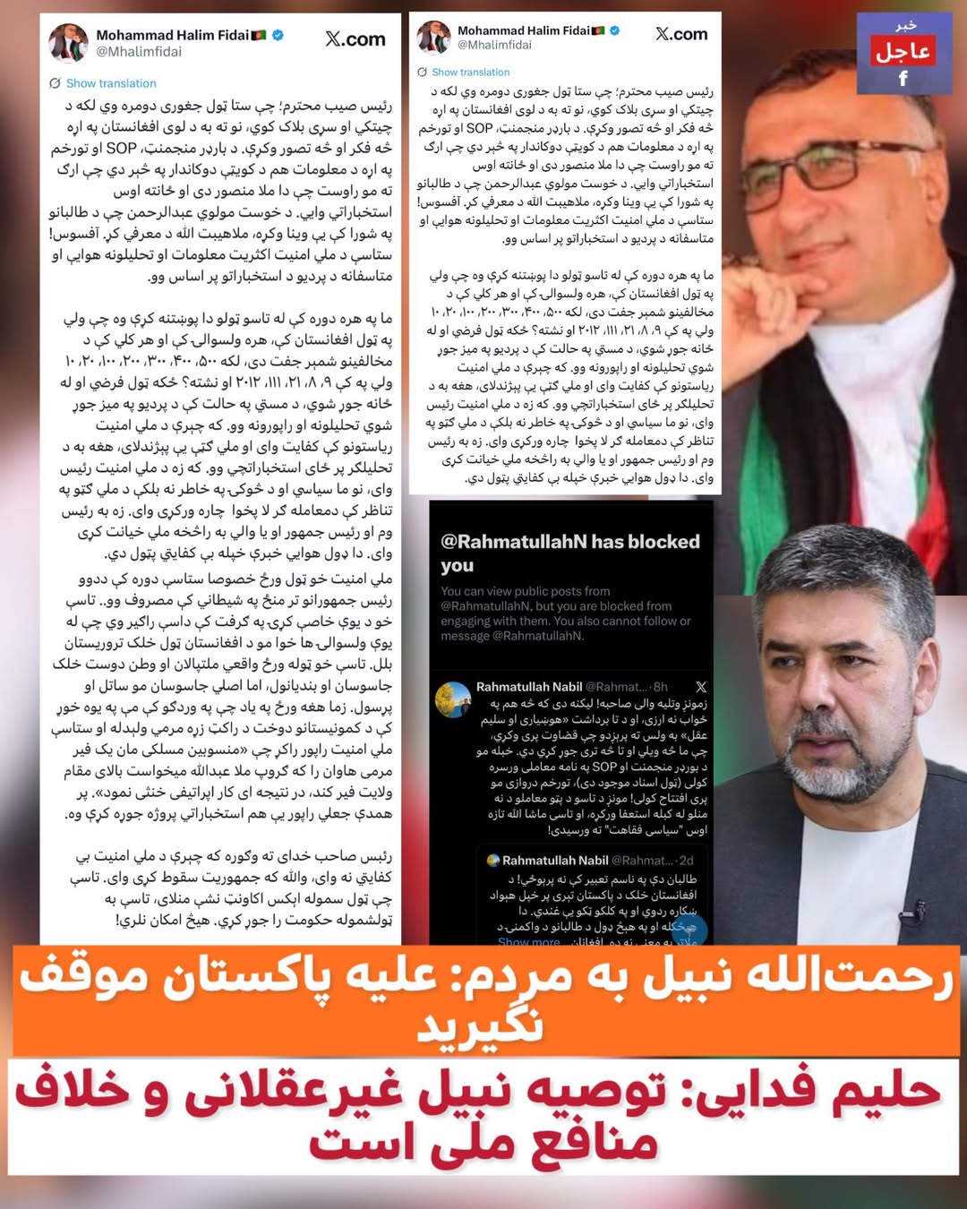 حلیم فدایی، والی پیشین، در پاسخ نوشت که پاکستان و طالبان هر دو دشمن ملت افغانستان هستند و توصیه نبیل «غیرعقلانی و خلاف منافع ملی» است. او تأکید کرد که اتخاذ موضع علیه پاکستان حتی اگر موقتاً به سود طالبان تمام شود، یک ضرورت راهبردی است و سیاستمداران افغان به دلیل نشناختن اولویتهای استراتژیک، بارها شکست خوردهاند.